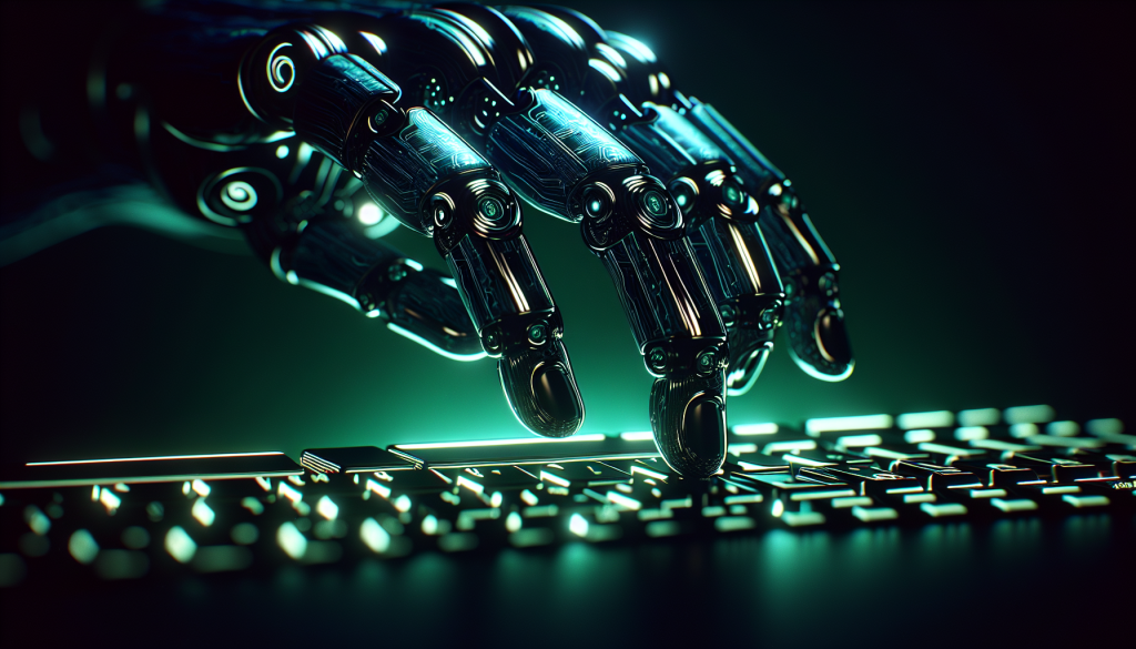 Futuristic AI robot hand typing on a keyboard
